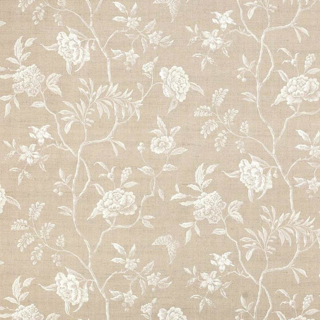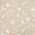 Tela bordada con motivos en forma de celosía ogee, formada por delicadas hojas y botones florales, sobre un fondo natural. Su diseño formal se equilibra con un drapeado delicado y tonos frescos.